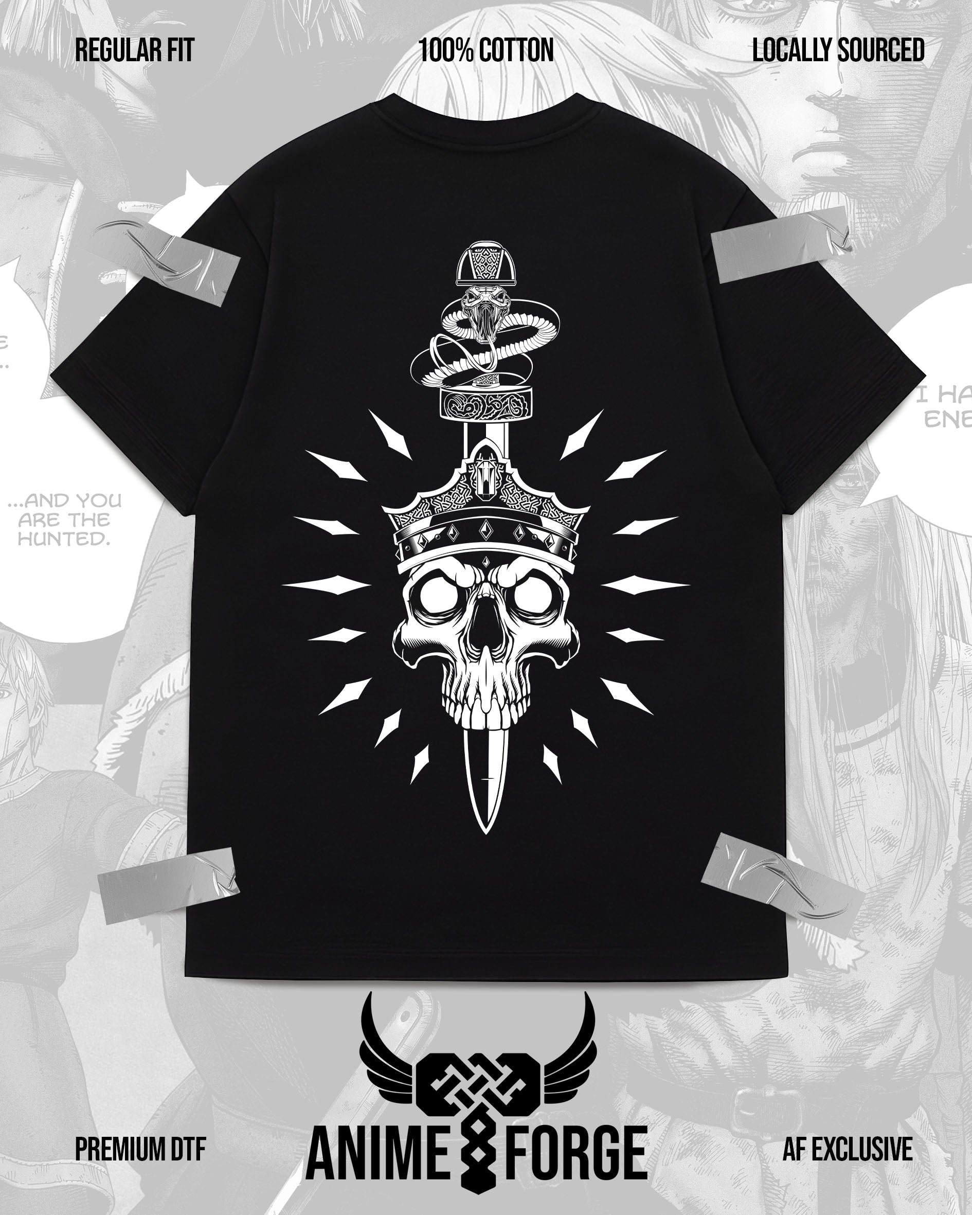 A reimagined panel of the snake and sword, transformed into a striking back print — snake, sword, skull, and crown entwined in one haunting image. Finished with a new Vinland Saga logo reworked into a Viking mask emblem.